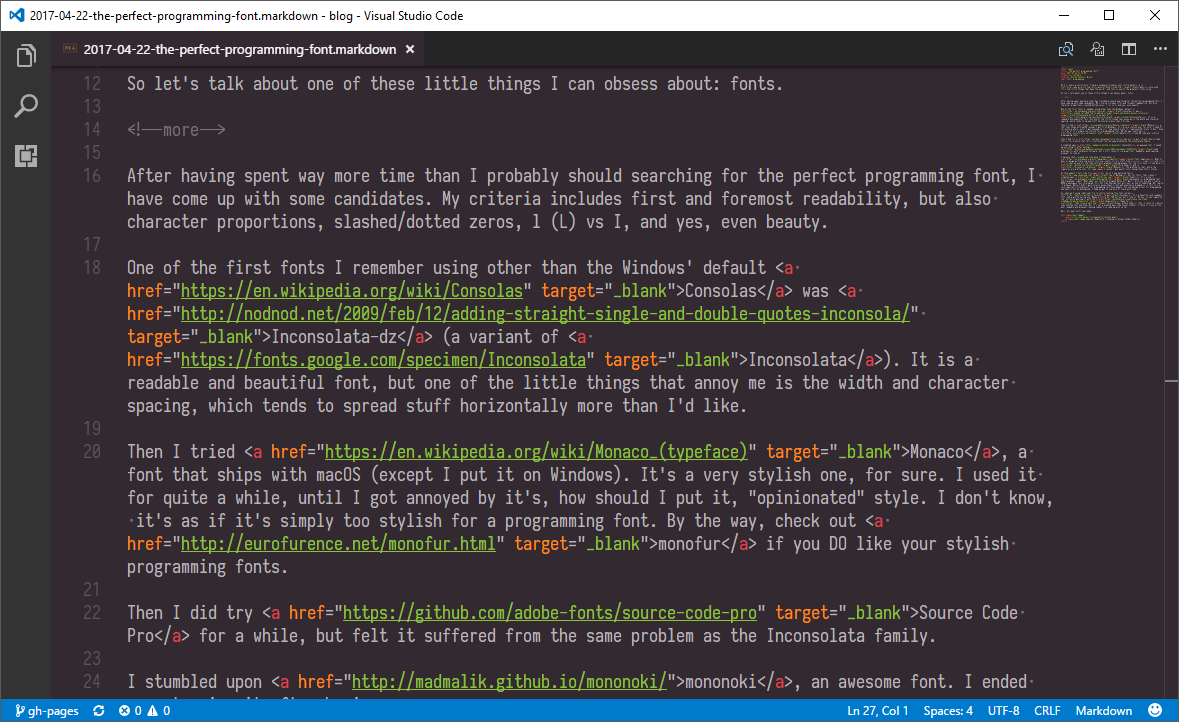 Then I tried Monaco, a font that ships with macOS (except I put it on Windows). It’s a very stylish one, for sure. I used it for quite a while, until I got annoyed by it’s, how should I put it, “opinionated” style. I don’t know, it’s as if it’s simply too stylish for a programming font. By the way, check out monofur if you DO like your stylish programming fonts.